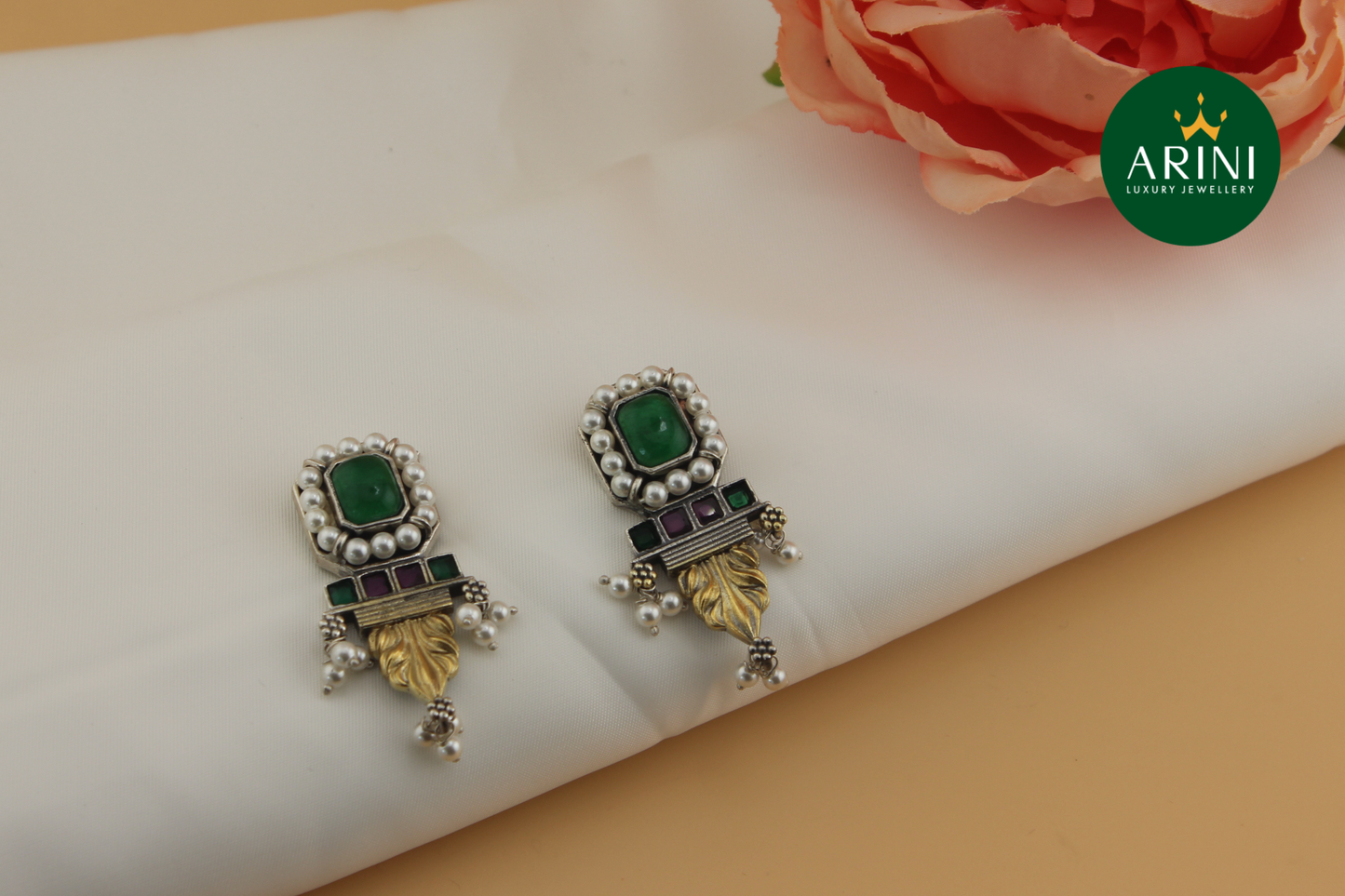 Add the Emerald Leaf Dual-Tone Earrings to your collection and embrace a timeless piece of art. Shop now to own this exquisite design!